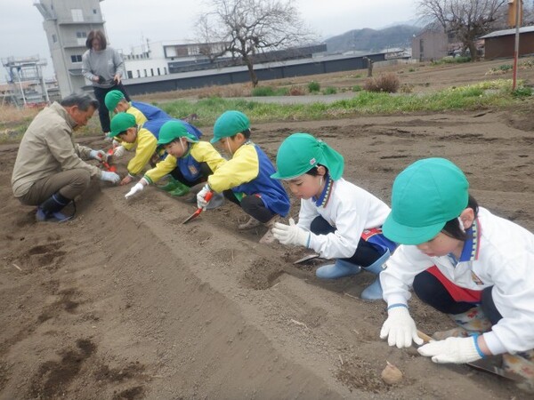 一ノ宮地域作り協議会のご厚意でジャガイモの種芋植えを行いました。 |