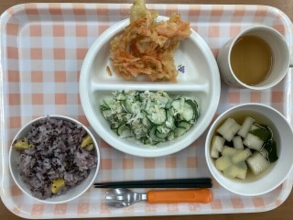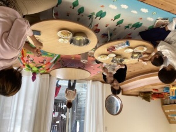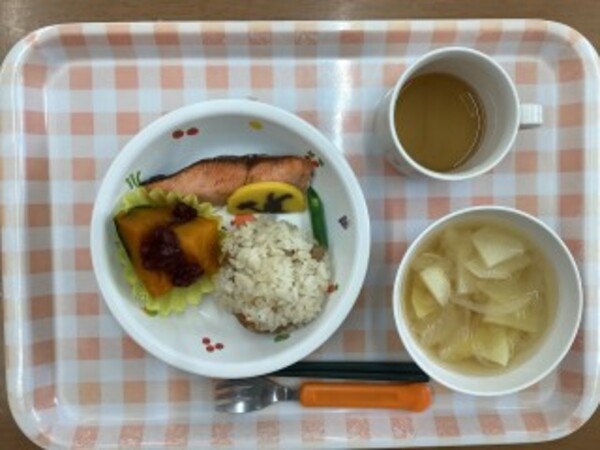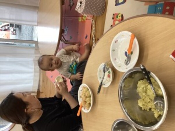 子育て支援センター「ピッコロクラブ」では、秋の味覚のサツマイモのおやつ作りでした。 |