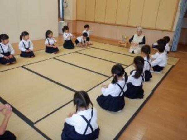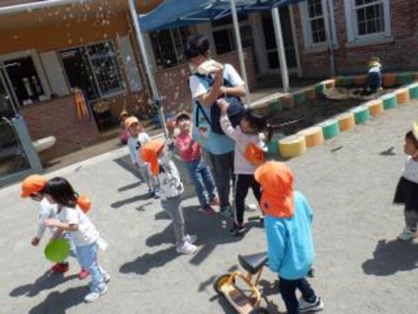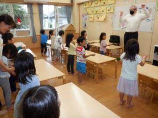 午後は、わくわくTimeの英語です。講師の先生とカード遊びや「金魚がにげた」の英語版絵本を見たりして遊びました。 |